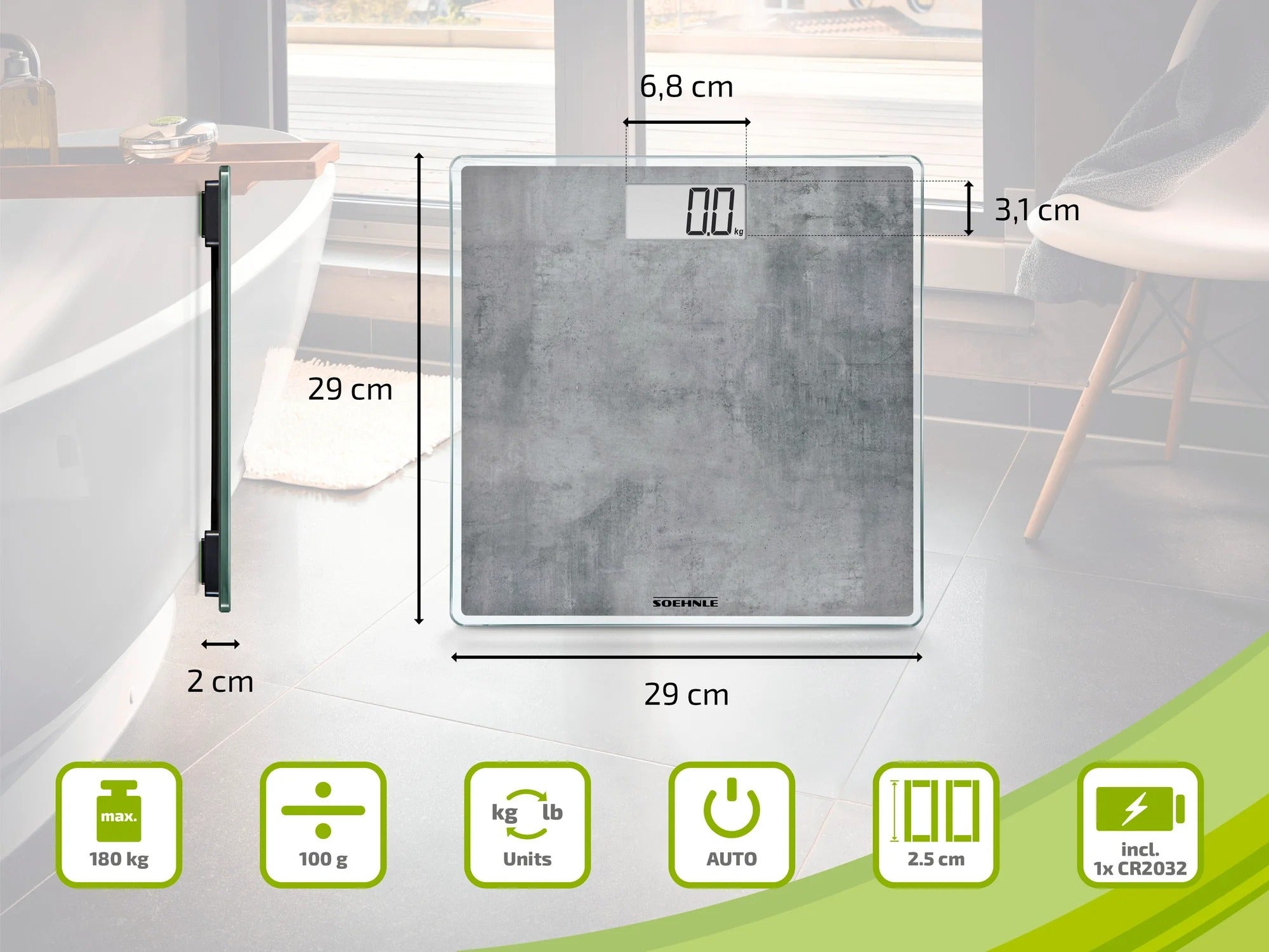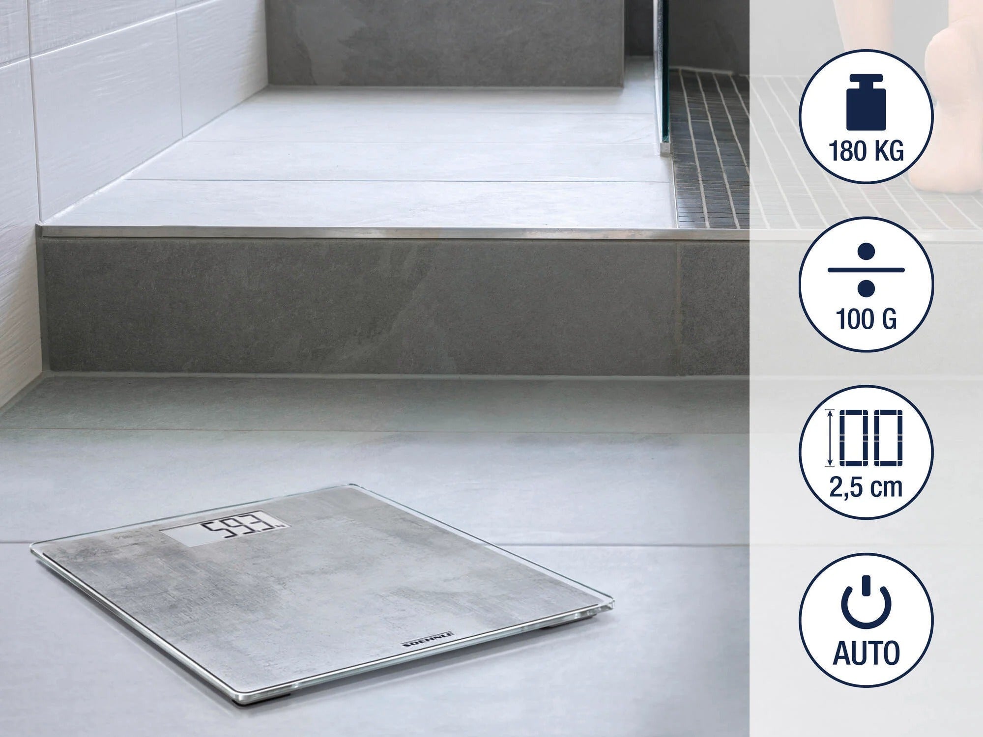 המשקל הדיגיטלי Style Sense Compact 300 Concrete מבית Soehnle, בעיצוב אלגנטי בהשראת בטון, הוא פריט עיצוב ייחודי שמוסיף סטייל לכל חדר. משטח השקילה הרחב עשוי זכוכית בטיחות איכותית, מבטיח עמידה נוחה ויציבה עם כושר נשיאה מרבי של 180 ק"ג. המשקל נדלק אוטומטית עם הדריכה עליו ומציג את תוצאת המשקל על גבי צג LCD בצורה ברורה וקריאה בדיוק של 100 גרם, ולאחר השימוש נכבה באופן אוטומטי – לחיסכון באנרגיה והארכת חיי הסוללה.