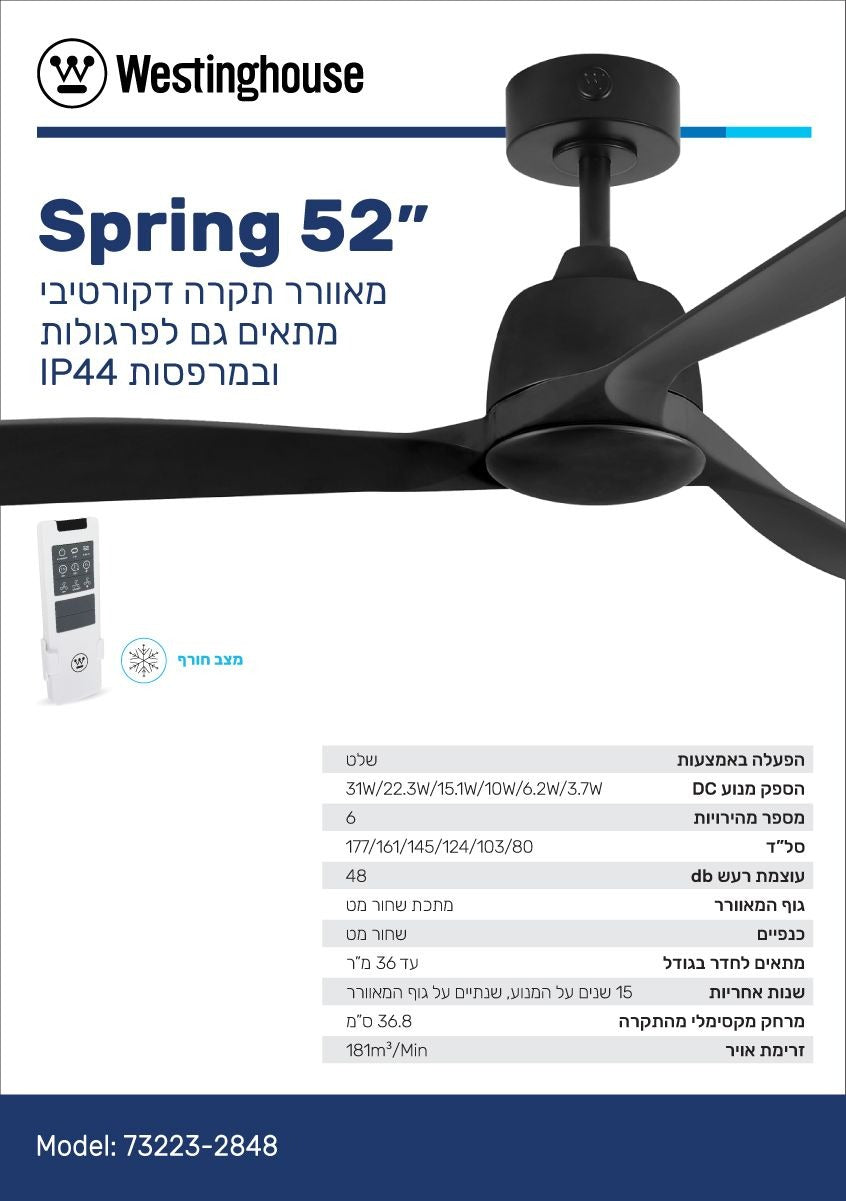 מאוורר תקרה איכותי מדגם SPRING 52" מבית WESTINGHOUSE, המיועד לשימוש פנימי וחיצוני - אידיאלי לפרגולות, מרפסות, סלון וחדרים גדולים. המאוורר כולל מנוע DC מתקדם ושקט במיוחד, שליטה מלאה באמצעות שלט, ועמידות גבוהה לתנאי חוץ בדרגת אטימות IP44.