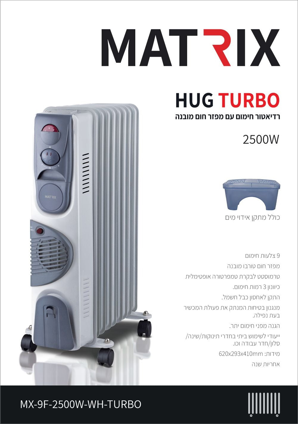 רדיאטור איכותי מדגם HUG TURBO מבית MATRIX בעוצמה של 2,500W, כולל מפזר חום טורבו לחימום מהיר ויעיל. מתאים לשימוש ביתי בחדרי תינוקות, חדרי שינה, סלון וחדרי עבודה. כולל 9 צלעות חימום לפיזור אחיד של חום, טרמוסטט לבקרת טמפרטורה מדויקת, ו-3 רמות חימום לחיסכון מרבי בצריכת החשמל. מצויד במנגנון בטיחות אוטומטי בעת נפילה, הגנה מפני התחממות יתר וגלגלים לניידות קלה. בנוסף, כולל מתקן אדים לשמירה על לחות נעימה והתקן לאחסון כבל החשמל.